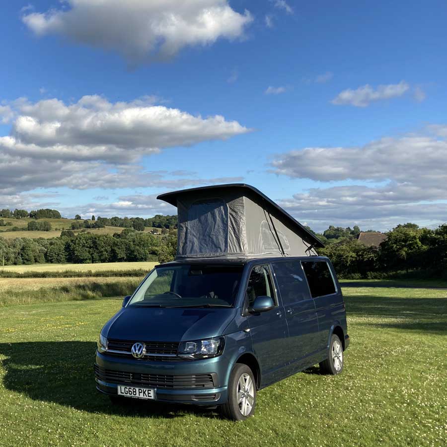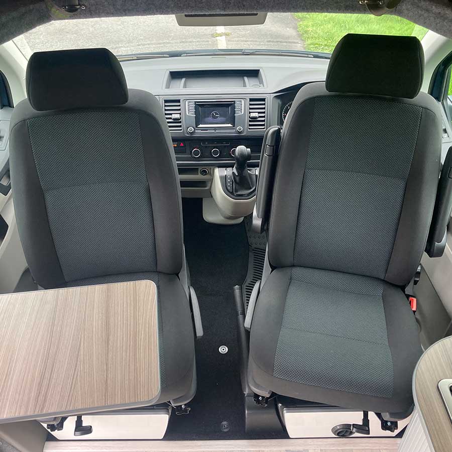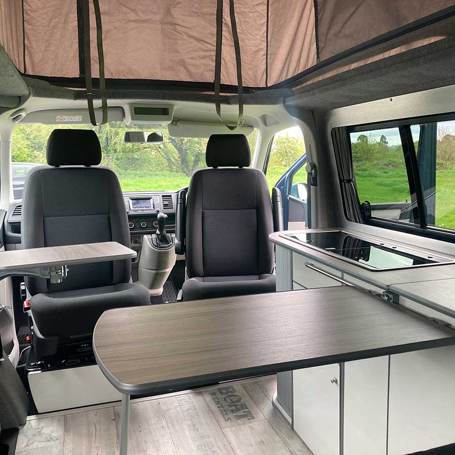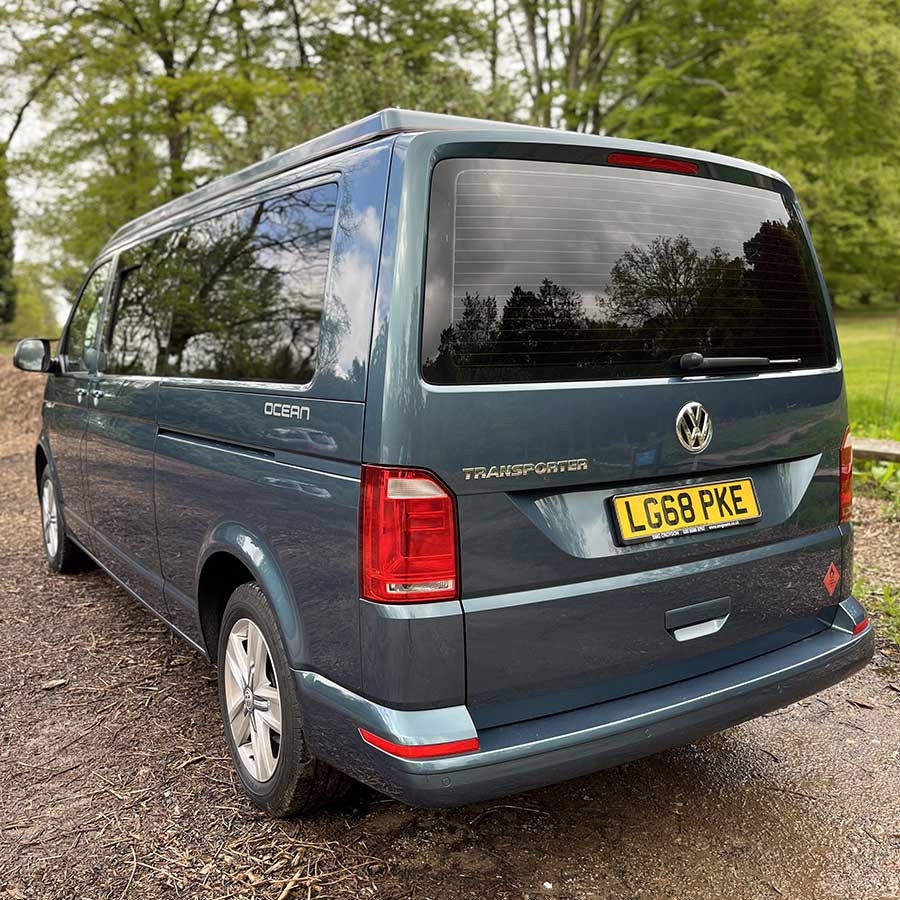 Ocean is a 2018, 4 berth Volkswagen Transporter, equipped with all essentials needed for a stress free trip. Finished in metallic green with 17 inch alloy wheels, Ocean is a campervan with a pop top roof and scenic canvas, so you can comfortably stand as well as enjoy beautiful views whilst relaxing in the elevating roof bed.