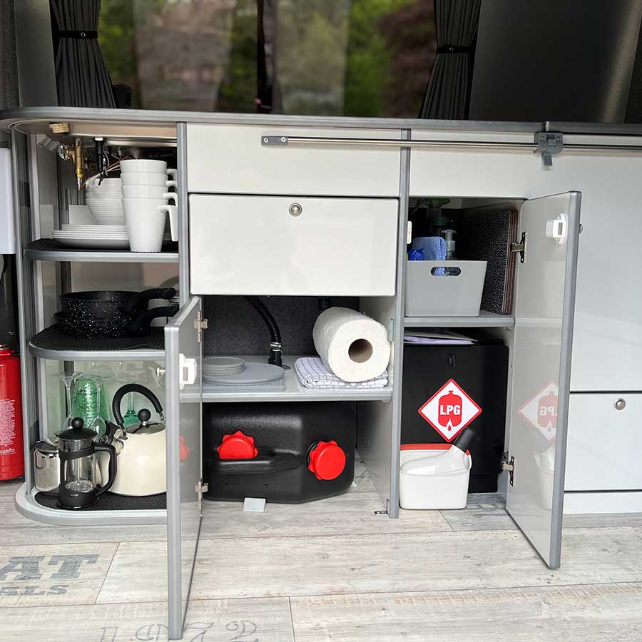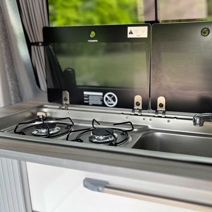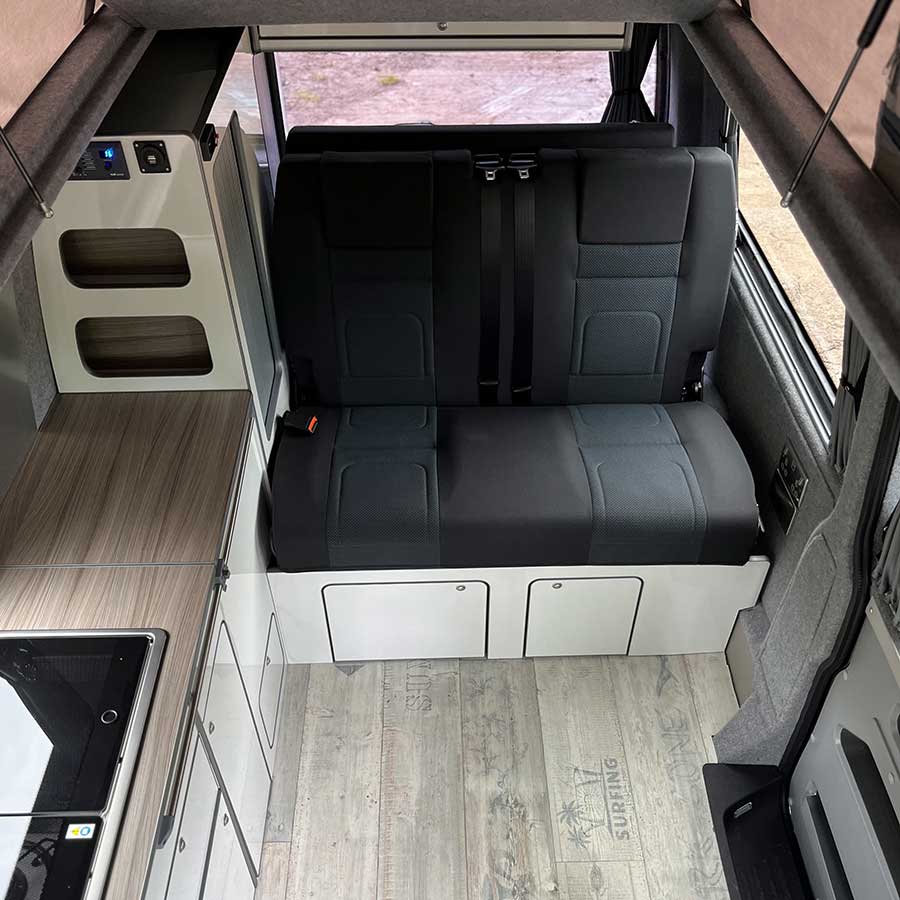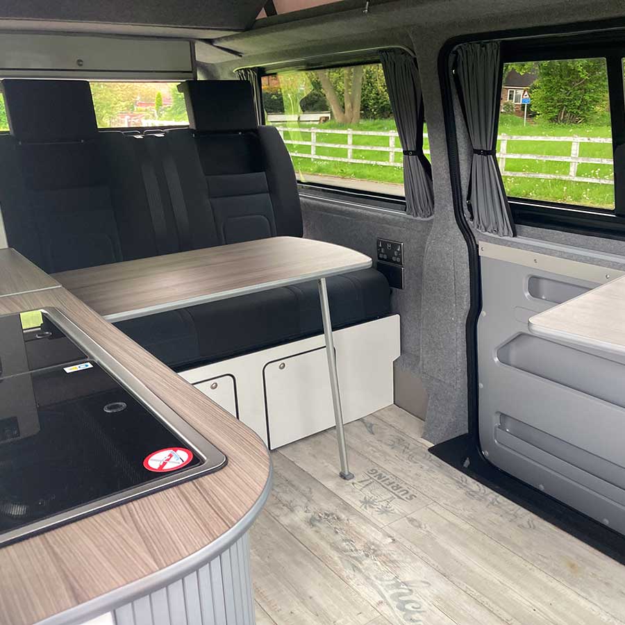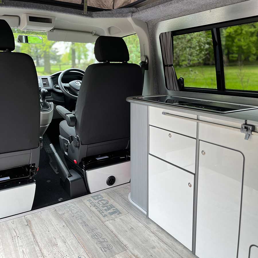 Ocean is a 2018, 4 berth Volkswagen Transporter, equipped with all essentials needed for a stress free trip. Finished in metallic green with 17 inch alloy wheels, Ocean is a campervan with a pop top roof and scenic canvas, so you can comfortably stand as well as enjoy beautiful views whilst relaxing in the elevating roof bed.